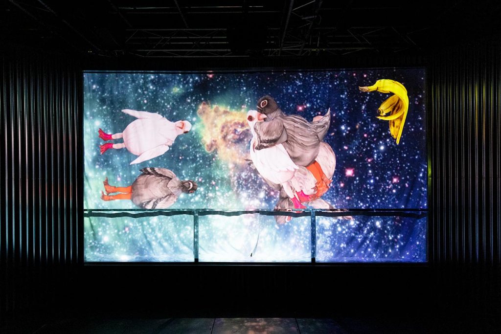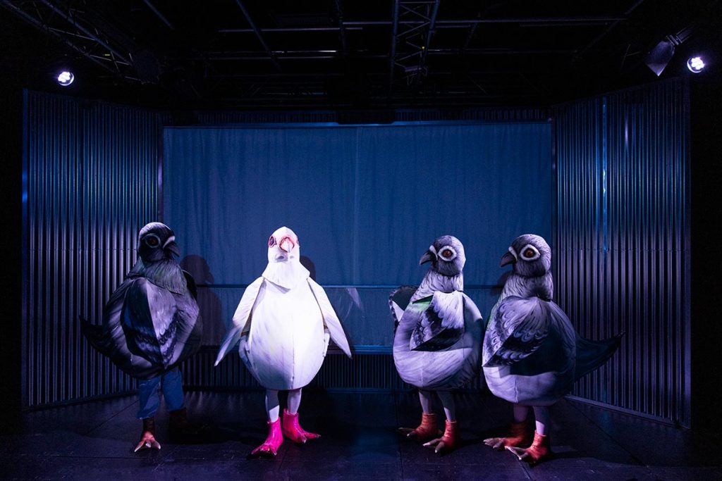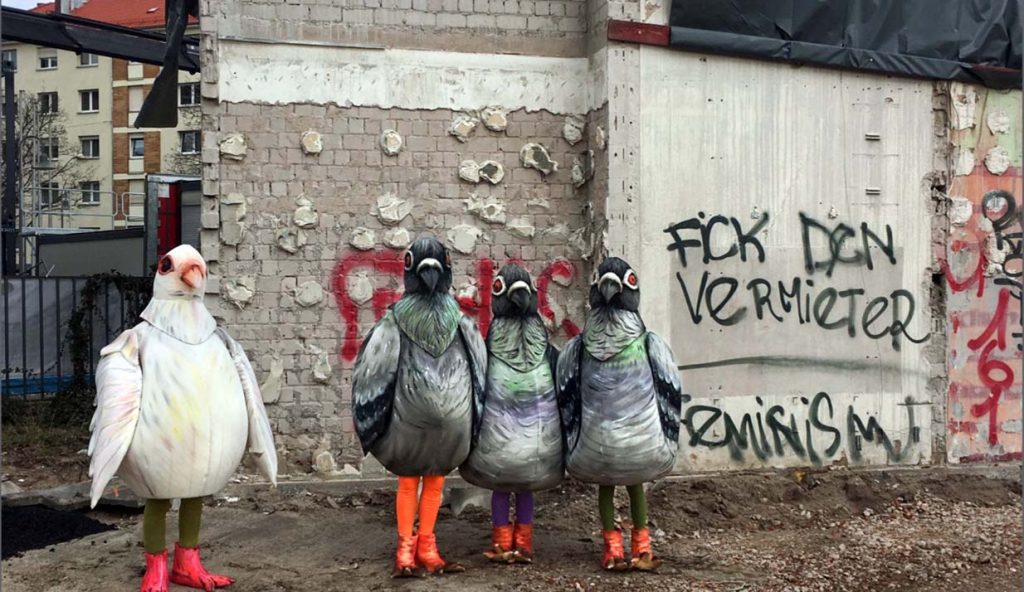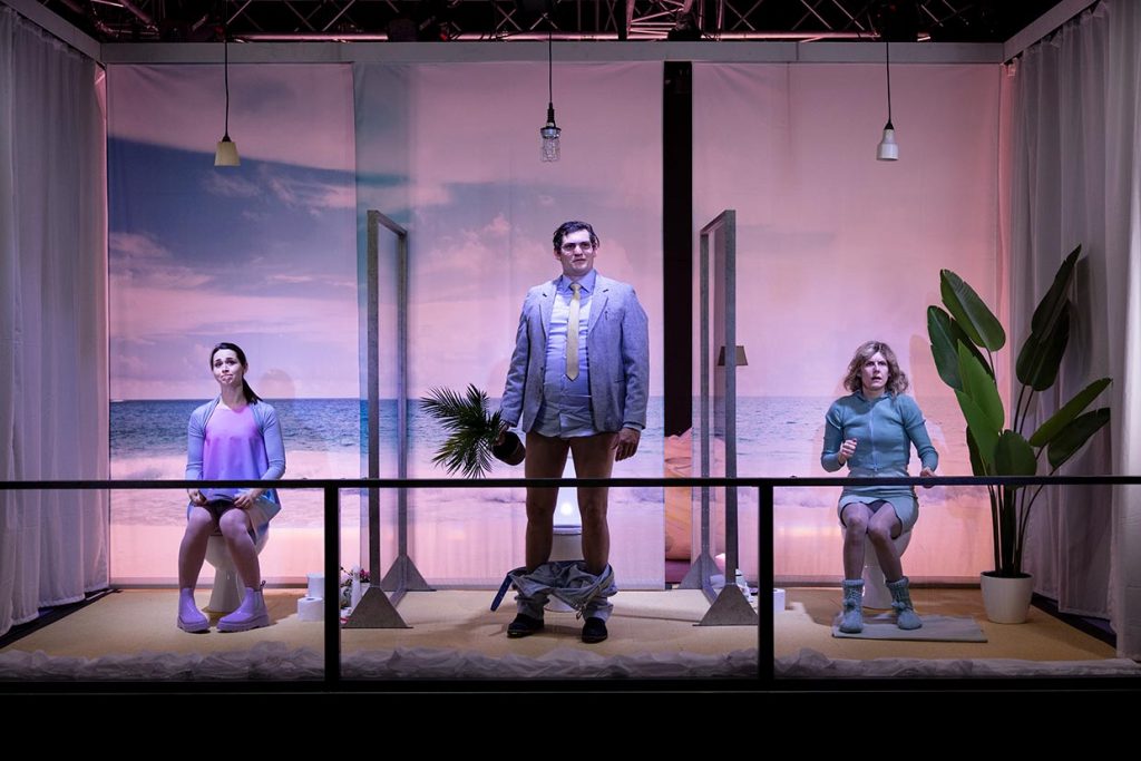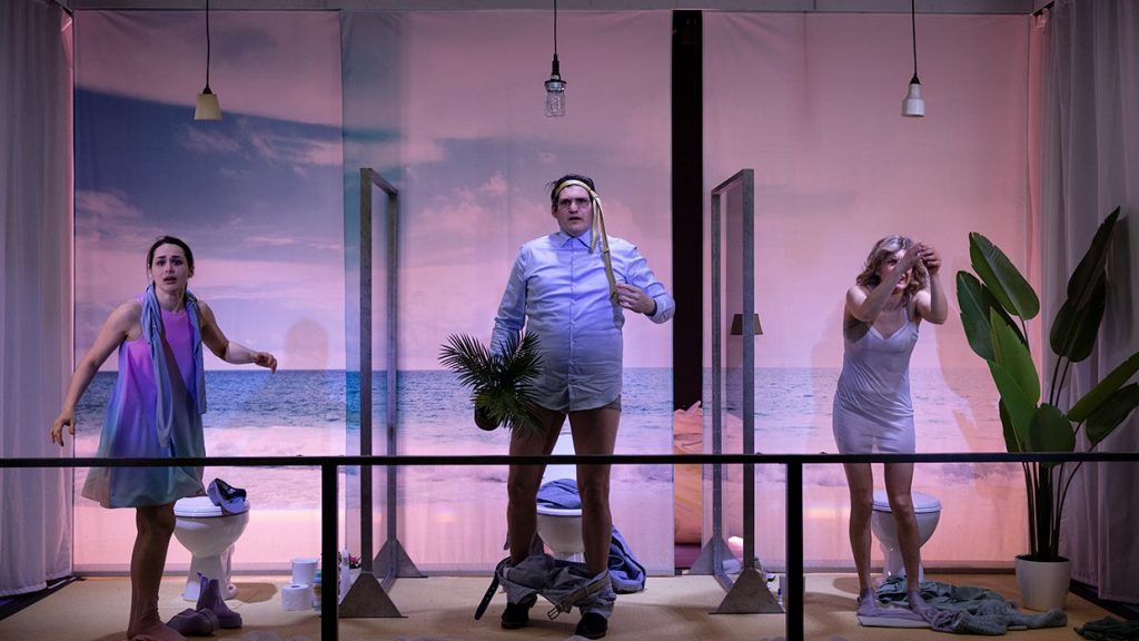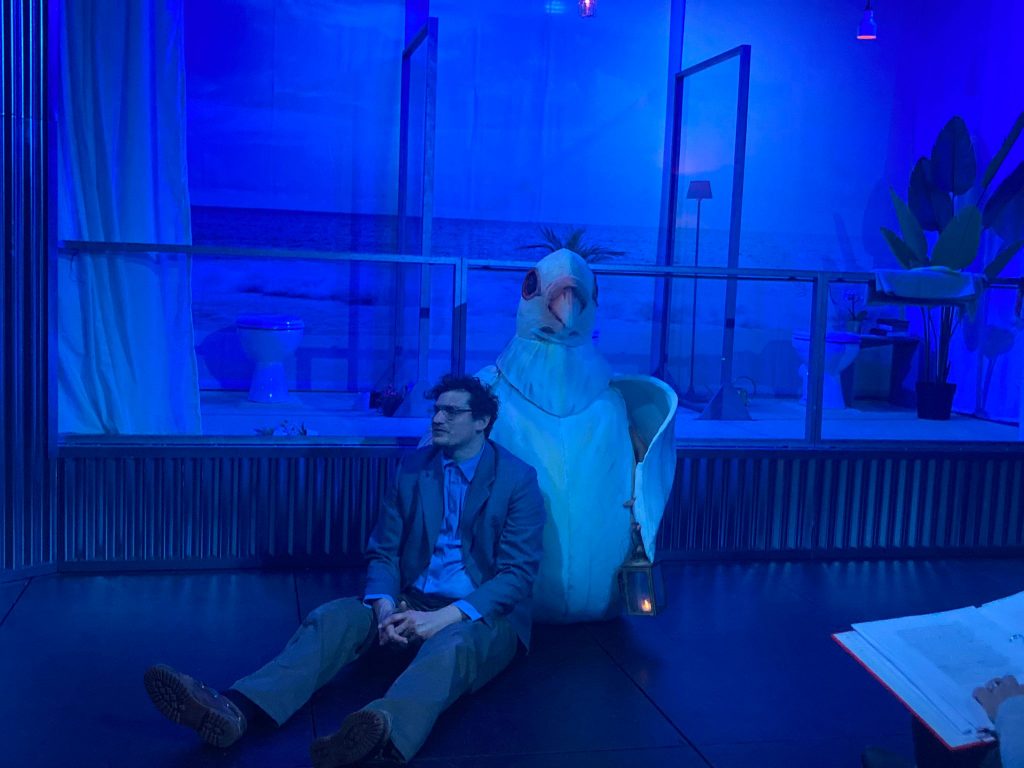 (…) Dieses Mehr ist durchweg präsent durch einen großen Vorhang, der die Rückwand dieses Guckkastens bildet und auf dem das Bild eines sanften blauen Meeres Wellen schlägt. Die Farben sind friedlich, pastellig und paradiesisch, harsch unterbrochen durch graues Metall und immer wieder eingeblendete Projektionen einer zubetonierten Stadt, bevölkert von übergroßen Tauben, die das Geschehen kommentieren.