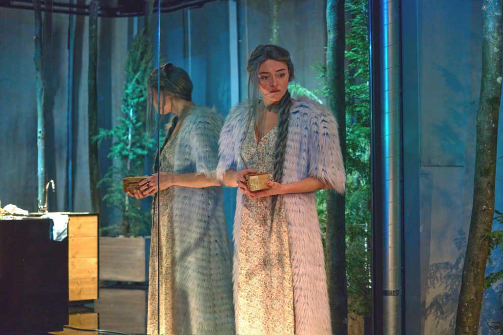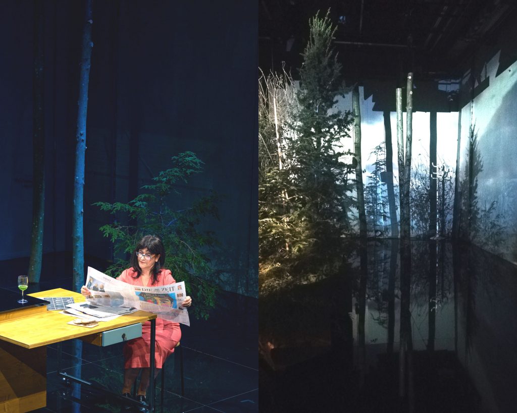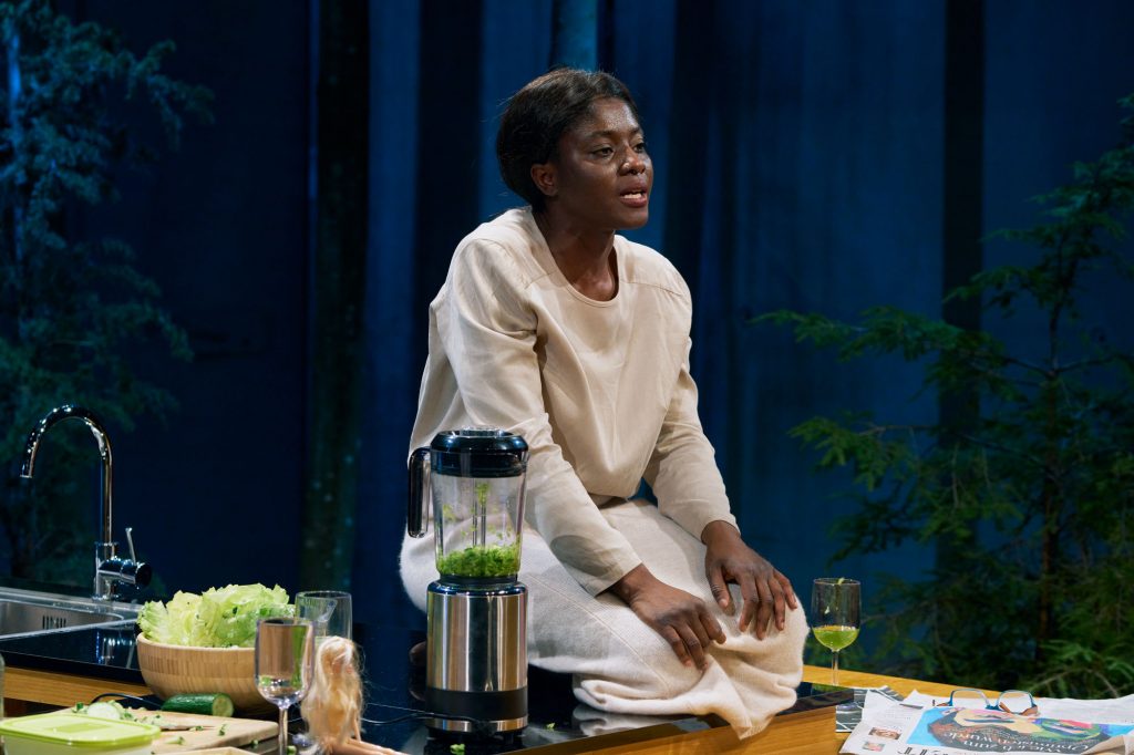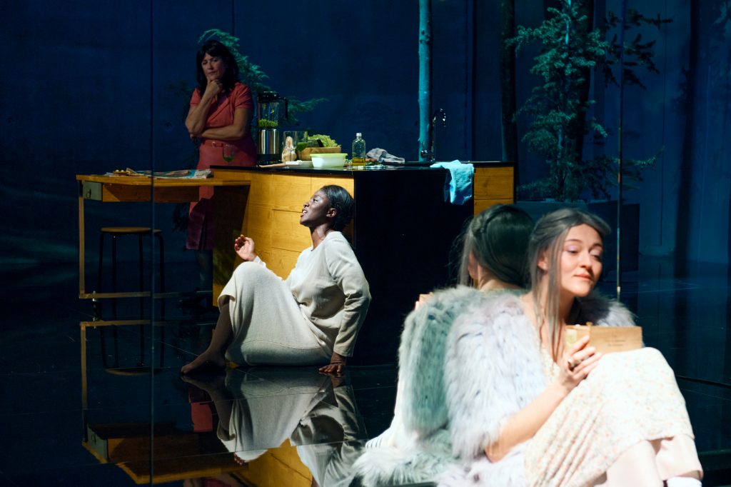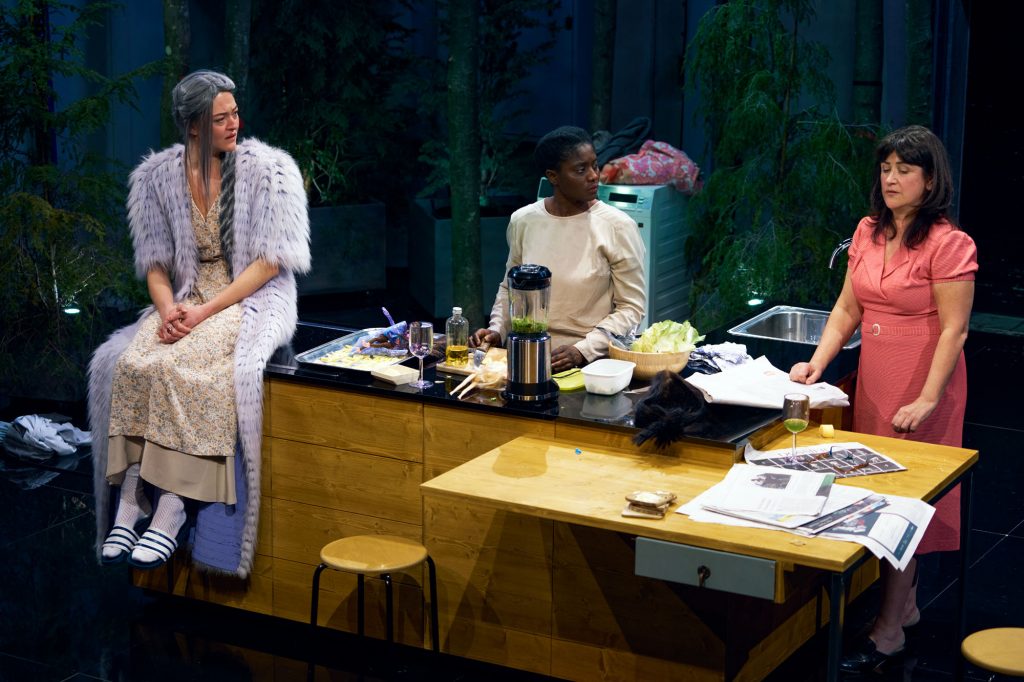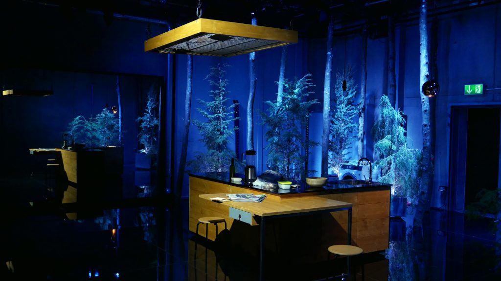 12. Mai 2025. Dieses Bühnenbild von Thurid Peine ist wirklich ein Wunderwerk der Raumöffnung. Im Herzen ein angedeuteter Haushalt, mittig ein Küchenblock, hinten eine Waschmaschine. Aber der gekachelte Boden und eine der Seitenwände sind so geschickt verspiegelt, dass der Raum schon etwas Schwebendes bekommt. Im Hintergrund stehen in großen Kübeln Nadelbäume, die wie ein düsterer Wald in die Küche wuchern.